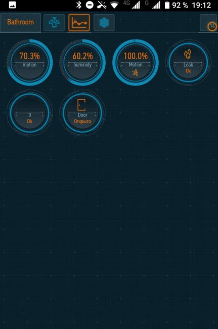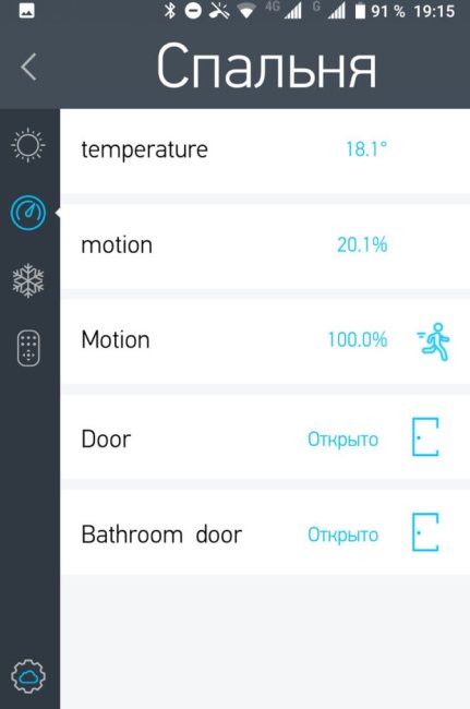 Отображение датчиков. Кстати, родные датчики движения от Larnitech, в отличие от подключаемых на дискретный вход, показатель движения выдают в процентах. Можно настраивать порог срабатывания.