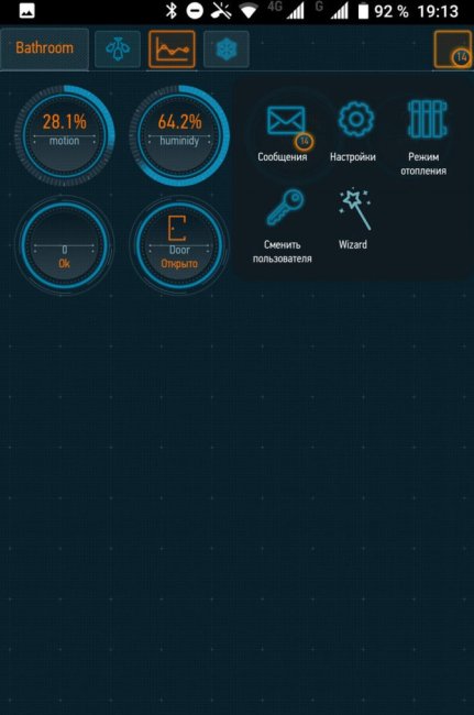 Меню справа: сообщения, настройки, переключение режима отопления, параметры подключения и мастер настроек автоматизации.