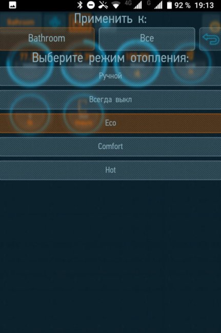 Изменение режима отопления. Можно менять для всей системы или для одного помещения.