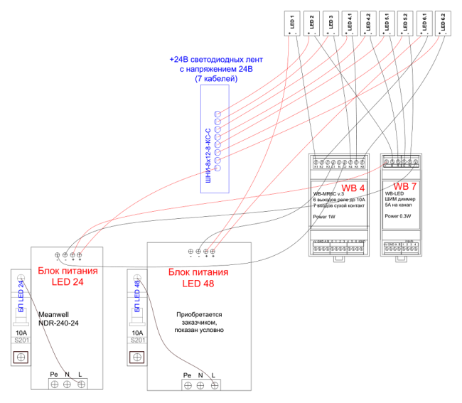 Вот схема управления светодиодными лентами в 3-комнатной квартире через реле и диммер Wirenboard из моего проекта.