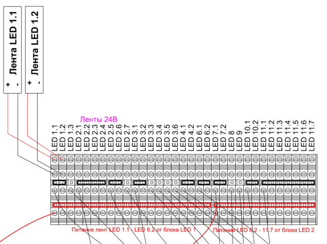 Над электрощитом расположили ещё один щит, в котором было больше десятка блоков питания разного размера, по одному блоку на каждую ленту. При этом силовые кабели шли до выключателей, потом обратно в щит на блоки питания, потом на светильники.