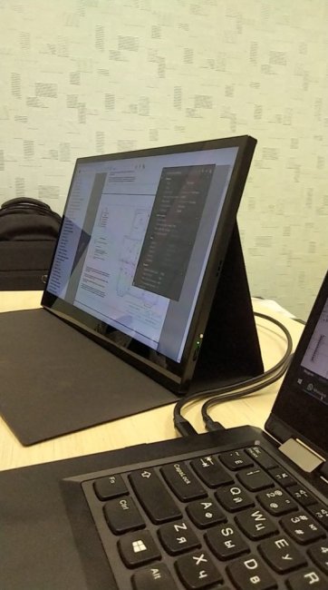 Напишу про опыт использования портативного монитора для ноутбука, так как нигде в интернете не нашёл полноценного отзыва на такую замечательную категорию товаров. Я привык работать на ноутбуке, но иногда хочется иметь экран побольше для возможности открыть на отдельном экране, например, дизайн-проект или какую-то документацию, а не переключаться между приложениями на одном экране. Поставить рядом с ноутбуком отдельный монитор 19 и больше дюймов — не понравилось, так как размер экранов разный, нужно «переключать зрение» между экранами. Пробовал какое-то время работать с шикарным 32-дюймовым монитором, но со временем даже стал забывать подключать его, настолько мне неудобно. Видно, что не я один такой, люди вовсю придумывают, как бы разместить ноутбук и монитор на одном уровне и друг рядом с другом, чтобы иметь возможность максимально удобно переводить взгляд с одного на другой. Производители давно предлагают на стационарном месте работы подключать ноутбук к док-станции, к которым подключены монитор, клавиатура и ещё куча устройств, чтобы быстро превращать ноутбук в полноценный стационарный компьютер. Тем более, что новый интерфейс Thunderbolt через разъём USB-C позволяет сразу передавать видео, звук и подключать USB устройства, без подключения HDMI. Но работать как на картинке выше, равно как и поставить отдельно большой монитор и клавиатуру, и не использовать экран и клавиатуру ноутбука мне неудобно, так как нет постоянного места работы. Я обнаружил замечательную категорию товаров, которые называются «портативный монитор». Они отличаются тем, что имеют диагональ до 15.6 дюймов, ставятся не на настольный кронштейн, а сразу ребром на стол, питаются через USB. Нашёл несколько моделей известных производителей: Lenovo ThinkVision M14, HP EliteDisplay S14, ASUS MB16AC и линейка Asus ZenScreen. Но ни единого полноценного отзыва об их работе! Только короткие обзоры-сравнения, сделанные на базе характеристик. И цена от 14 тысяч рублей, то есть, сильно (вдвое и больше) дороже полноценных мониторов с диагональю от 21.5 дюймов. Asus Zenscreen, 15.6″, сенсорный экран, 32 тысячи рублей Подключение портативных мониторов происходит либо через HDMI отдельно питание через адаптер, либо через USB-С с поддержкой Thunderbolt, по этому интерфейсу передаётся сразу всё. Кстати, при выборе ноутбука надо отдельно смотреть на то, есть ли у него интерфейс Thunderbolt, так как наличие USB-C не означает наличия Thunderbolt. В основном такие мониторы позиционируются не столько как для компьютера, сколько для смартфона или портативной игровой приставки. Такое ощущение, что я сам какую-то ерунду придумал — к ноутбуку портативный 14″ монитор подключать… Тогда я обнаружил большое количество портативных мониторов по более низкой цене на Aliexpress. Как ни странно, модели с диагональю 14″ стоят дороже моделей 15.6″. Но цены уже адекватнее — до 10 тысяч рублей, а иногда и до 6. Как я уже давно выяснил, на Aliexpress не стоит покупать что-то супердёшево, надо покупать просто дёшево. Например, если в России стекло для экрана смартфона стоит 600 рублей, то не надо на Aliexpress покупать его за 60 рублей, так как это будет совсем мусор, а следует купить за 300 рублей, и это будет отличный товар. Правило, конечно, не во всех случаях работает, но стекло за 1 доллар никак не может быть качественным, а со стеклом за 5 долларов есть вероятность, что оно будет качественным. Поэтому я