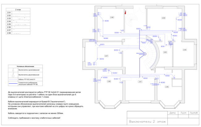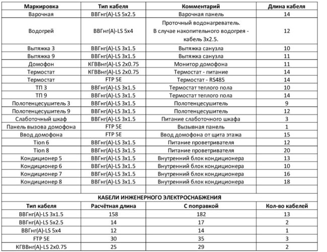 На листе присутствует таблица помещений, номера помещений на плане, обязательно условные обозначения, комментарии по тому, какой кабель куда выводить, вплоть до запаса по длине в местах вывода. Нет лишних элементов: мебели, сантехники, дверей, которые бы ухудшили восприятие.