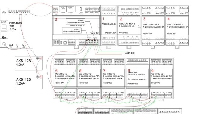 Схема подключения питания и шины модулей Wirenboard: