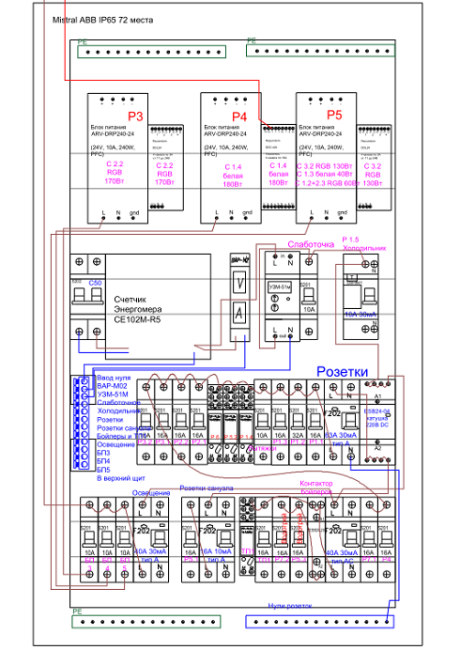 Однолинейную схему на электроснабжение я не делаю, только на слаботочное питание контроллера и элементов автоматики. Зато есть схема сборки щита с обозначением всех соединений кабелей в нём, по ней отлично видно, что куда подключается. Обычно прорисовываются кабели фаз и слаботочные кабели, без нулей.