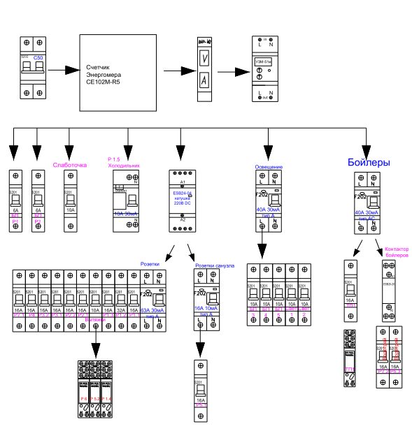 Посмотрите на фрагмент официального, сделанного согласно ГОСТ грамотным проектировщиком, согласованного проекта электрики: