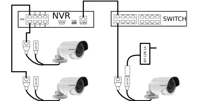 Так вот, IP камера подключается к компьютерной сети интерфейсом Ethernet, то есть, витой парой. Питание камеры либо 12 вольт отдельным кабелем, либо через ту же витую пару (это называется PoE — power over ethernet). Существует даже специальный комбинированный кабель UTP + ШВВП для питания, но использовать PoE гораздо удобнее, если только камера не слишком далеко, тогда нужно искать источник питания рядом с камерой. Вот такую схему нашёл, достаточно понятную: камеры подключены к коммутатору в одной локальной сети, питание от блока питания 12 вольт либо видеосервера со встроенным коммутатором с PoE.