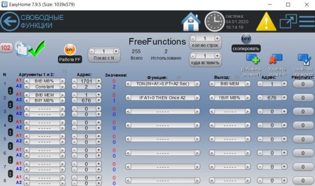 Для настройки этого алгоритма нам надо влезть в Свободные Функции — это специальные возможности настройки контроллера EasyHome, которые позволяют реализовать в достаточно широких пределах разные такие штуки. Во многих контроллерах это реализовано через отдельные пользовательские скрипты, например, в Fibaro Home Center 2 — на языке LUA, а в EasyHomePLC несколько непривычным, но также функциональным способом.