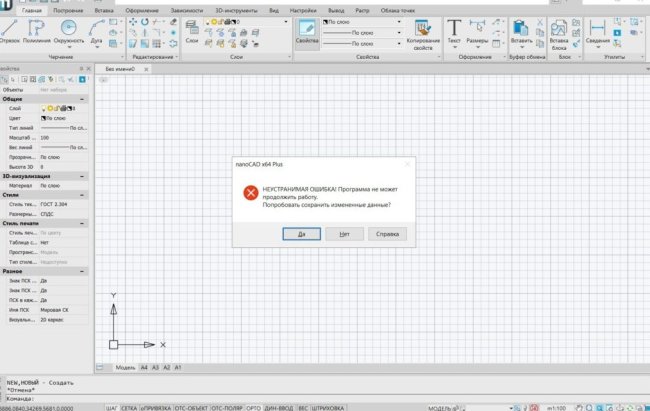 Столкнулся со внезапной проблемой, которая окончила мой опыт использования nanoCAD. При любом нажатии кнопки Escape (которую нажимать надо часто, так как она отменяет выделение объекта) программа выдаёт страшное окно «НЕПРЕДВИДЕННАЯ ОШИБКА! Программа не может продолжать работу» и вылетает.