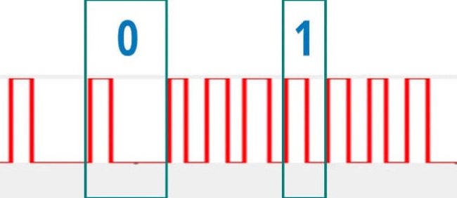 Резюме: 0 и 1 кодируются только тем, как долго горит ИК-диод (лампочка) и как долго не горит.