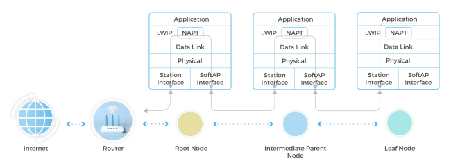В архитектуре ESP-Mesh-Lite подузлы имеют прямой доступ к внешним сетям. Таким образом, без необходимости участия пользовательского приложения, обеспечивается бесшовное сетевое соединение. Следовательно, архитектура ESP-Mesh-Lite обеспечивает легкую масштабируемость сети для различных категорий устройств. Кроме того, ячеистая сеть постоянно поддерживает подключение других стандартных устройств Wi-Fi, что повышает общую адаптивность сети.