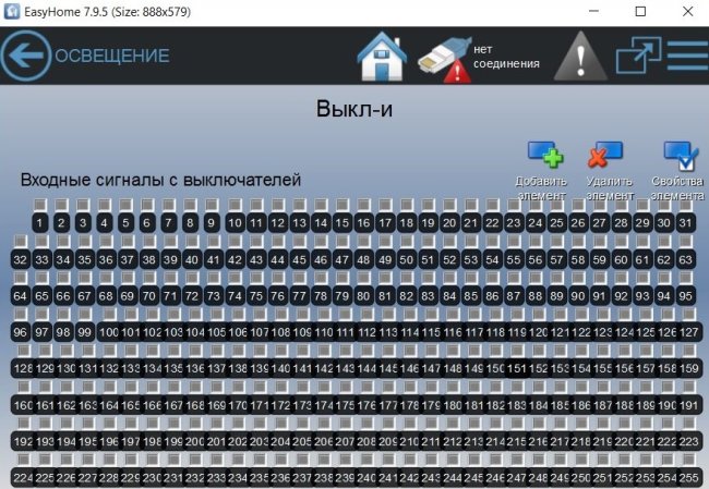 К системе может быть подключено 255 выключателей. Если приложение подключено к контроллеру, а выключатели заведены на входы и проассоциированы как выключатели, то при нажатии клавиши выключателя соответствующая номеру выключателя ячейка будет становиться зелёной. Вот так:
