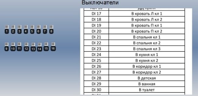 В таблице выше выключателям ассоциированы номера дискретных входов (DI) контроллера, можно добавить ещё столбец номера выключателя от 1, но в данном случае несложно его посчитать.