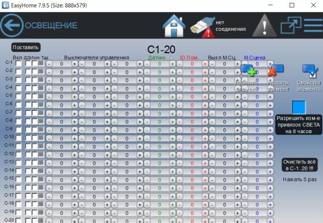 Далее есть два способа ассоциирования света выключателям: через сводную таблицу и через интерфейс. Сводной таблицей можно пользоваться, если мы проделали всё вышеописанное и знаем, какой номер лампочки, выключателя и датчика движения соответствует какому физическому элементу. Сводная таблица (в EasyHome меню Освещение — Сводная таблица) выглядит так: