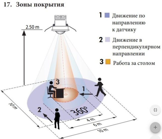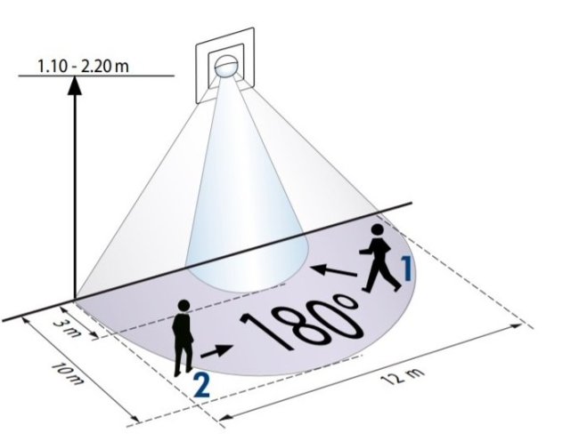 Область видимости такого датчика — конус. Чем он ниже висит, тем меньше зона обнаружения. У китайских датчиков зона обнаружения при высоте установки 2,5-3 метра получается небольшая. Она даже в описании нигде не написана, надо экспериментировать.