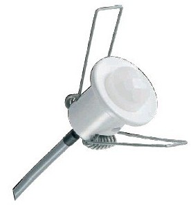 Стоит меньше тысячи рублей, диаметр порядка 105мм, дальность обнаружения до 10 метров (при высоте установки 5 метров), угол 360 градусов. Поскольку потолок обычно ниже 5 метров, то и дальность у него будет сильно меньше, зато смотрит во все стороны.