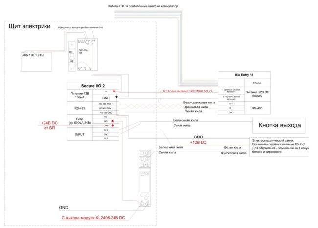 Для второго варианта нужно заранее продумать схему подключения всех устройств и варианты открывания замка. Например, считыватель Suprema и электромеханический замок требуют подключения к разным источникам питания, оба требуется зарезервировать аккумуляторами. Устройство Secure I/O имеет достаточно слабое встроенное реле, на него не подключить замок, нужно реле отдельное. Если замком помимо считывателя управляет контроллер умного дома или GSM контроллер, то нужно подключить управляемое ими реле параллельно реле считывателя, чтобы системы работали независимо.