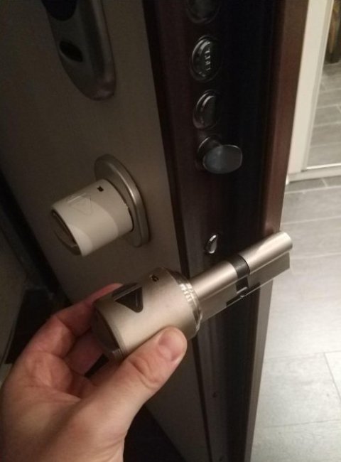 При необходимости установки замка в существующую дверь на помощь приходят устройства, совмещающие в себе электропривод замка и цилиндр. Например, достаточно известный Danalock V3. Установка крайне проста за счёт того, что это никакой не замок, а просто электропривод, который вращает изнутри двери цилиндр существующего замка. Подробнее я писал про него тут.