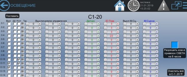 Либо он активен и ассоциирован группе света, либо он не ассоциирован группе света, то есть, ничего не включает, либо он ассоциирован, но в настоящий момент не работает. Чтобы изменять статус датчика «работает» — «не работает», надо просто на него нажать. Это соответствует установке галочки ДД в Сводной таблице освещения.