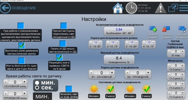 Из интересных настроек здесь есть «Астрономический датчик освещённости», который позволяет настроить, чтобы свет включался только если освещённость ниже заданной, причём при отсутствии реального датчика освещенности, и время работы света по датчику для основной и проходной зоны.