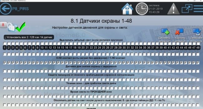 Для каждого датчика можно задать, принадлежит он к основной или проходной зоне (разные задержки времени), является он нормально-замкнутым или нормально-разомкнутым, надо ли по нему включать свет днём или нет.