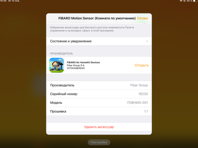 Наконец, мне в руки попали два устройства Fibaro для работы с Apple Homekit. Это регулятор на батарею Heat Controller и датчик движения Motion Sensor. У Fibaro, напомню, есть две линейки устройств: работающие по протоколу Z-Wave и совместимые с Homekit. Это две разные линейки, устройство не может работать сразу и с Z-Wave, и с Homekit. Выглядят устройства одинаково, отличаются только упаковкой. Устройства Fibaro для Homekit продаются официально в России с конца 2018 года, в ассортименте следующие устройства: регулятор на батарею с отдельным датчиком температуры (7100 рублей) датчик угарного газа (6560 рублей) датчик протечки воды (7300 рублей) датчик открывания двери/окна (5900 рублей) датчик движения (7080 рублей) одноканальное реле (6390 рублей) модуль в розетку (6500 рублей) Я подробно опишу работу системы Homekit и особенности двух модулей. Fibaro Heat Controller для Homekit (FGBHT-001) Существует множество регуляторов на радиатор, но у всех у них есть огромный недостаток — датчик температуры у них встроенный в них же. То есть, регулятор ориентируется на температуру на встроенном датчике, которая, разумеется, сильно отличается от температуры воздуха в помещении. Особенно если над радиатором подоконник, тогда датчик в регуляторе при нагреве радиатора сразу покажет очень высокую температуру. Как показал мой опыт, регуляторы системы Z-Wave не удалось настроить так, чтобы они работали по внешнему датчику температуры. Но, чтобы исправить это недоразумение, Fibaro некоторое время назад выпустила Heat Controller — регулятор на батарею, в комплекте с которым идёт беспроводной датчика температуры, он связывается с регулятором по радиоканалу и позволяет действительно комфортно регулировать температуру. Один датчик можно связать с несколькими регуляторами. Вслед за выпуском этого устройства для Z-Wave появился вариант для Homekit. Вот он: В комплекте сам регулятор с посадочным местом М30х1.5, подходящим для почти всех батарей, два переходника для батарей Danfoss, датчик температуры. Датчик действительно очень маленький, его вполне можно и потерять. Диаметр датчика 38мм, высота 12мм. Сзади у датчика крышка, которая снимается достаточно легко даже без инструмента, под ней батарейка. Также в комплекте маленький металлический инструмент для нажатия кнопки программирования на регуляторе и датчике. Отверстие этой кнопки на датчике сзади. Вот так выглядит регулятор, установленный на обычную батарею в квартире: На регуляторе виден разъём для зарядки от microUSB и чуть выше него отверстие кнопки. После установки нажимаем кнопку, устройство включается и слышно, как работает в нём мотор, калибруясь. У регулятора подсвечивается ободок справа, по цвету подсветки (от синего к красному) можно понять, на какую уставку температуры он выставлен. Можно крутить регулятор по часовой стрелке или против, цвет будет меняться. Синий соответствует 16 градусам, разные оттенки зелёного от 19 до 21, красный 24, розовый — полностью открыто. Примерное время работы регулятора от одной зарядки аккумулятора — 10-11 месяцев. Может работать и без датчика температуры, тогда будет ориентироваться на встроенный в него датчик. Кстати, можно удержанием кнопки до появления красной подсветки регулятора запретить ручную регулировку, для защиты от детей или животных. Далее связываем регулятор и датчик температуры, они из коробки не связаны между собой. Нажимаем длительно на кнопку на регуля