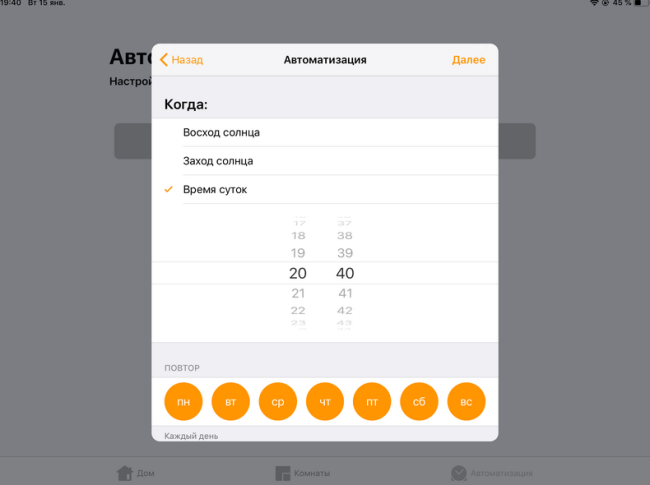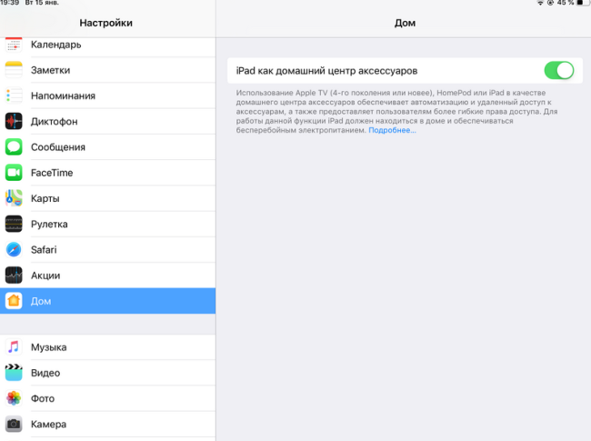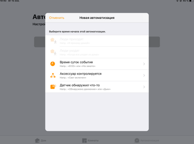 Третий пункт меню — Автоматизация. Он интереснее. Чтобы работали сценарии устройств, что-то должно ими управлять. Лучше всего подходят устройства AppleTV и колонка Apple HomePod. Если их нет, то можно использовать как управляющий элемент iPad или iPhone. Для этого надо включить в настройках приложения Дом эту возможность.