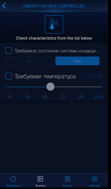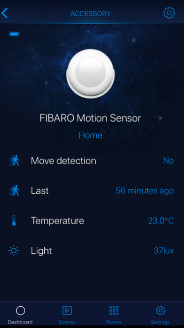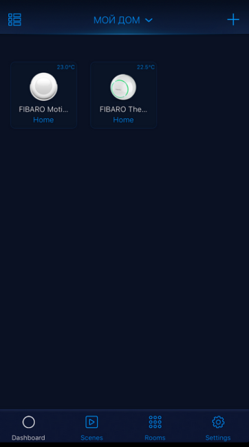 Fibaro оказалось мало стандартных возможностей или не понравился интерфейс приложения Дом, поэтому они написали своё приложение для работы с устройствами Homekit — FibaroHome. Приложение получает доступ к Дому и, как я понял, просто предлагает управление устройствами в другом интерфейсе. Доступно только для iPhone, на планшете открывается в мелком виде. Вот главное окно: