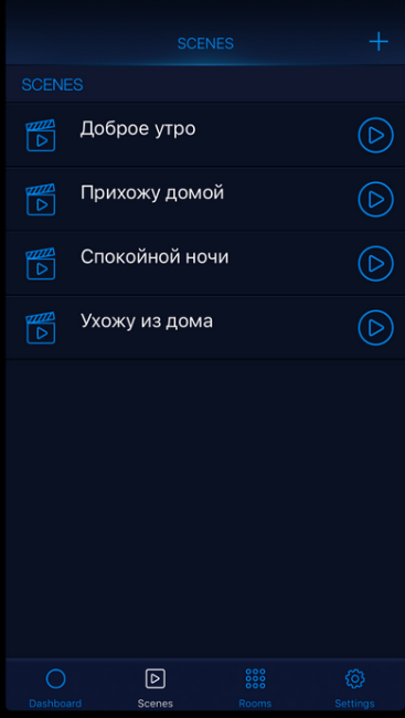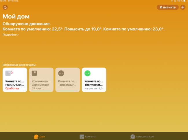Если переключимся на Комнаты в меню внизу, то увидим список элементов по комнатам. У меня комната всего одна, так что не многое изменилось.