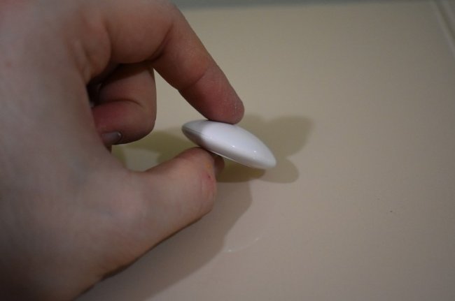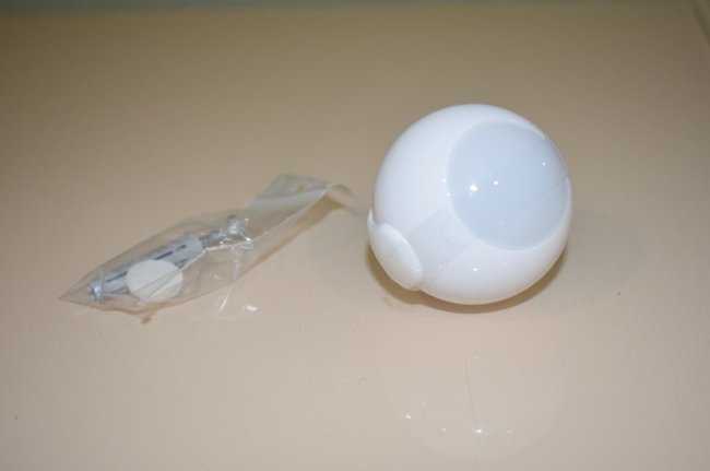 В комплекте сам сенсор и саморез с дюбелем для его крепления. Внутри установлена батарейка. Ставим датчика в удобное место и вынимаем бумажную прослойку между батарейкой и контактом — датчик начинает работать. Активно моргает разными цветами.