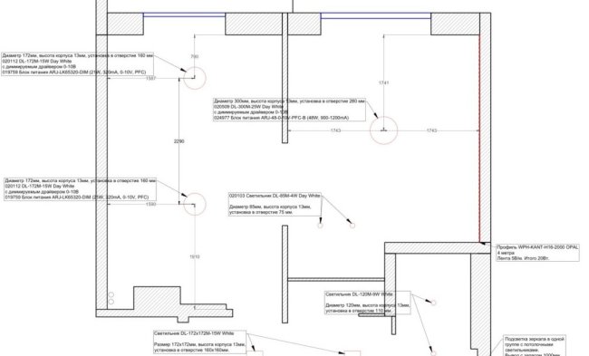 На основе обмерного плана квартиры и плана расстановки мебели сделана расстановка розеток, выключателей и светильников в квартире. На плане есть очень важная информация: рядом с каждой лентой и светильником подписаны модель и мощность. Это даёт понимание того, какой тип кабеля и блок питания нужен ленте, как диммировать светильники.