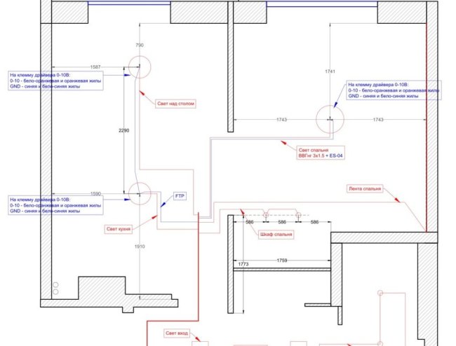 Просчитаем на небольшом примере систему Умный Дом на контроллере EasyHomePLC для двухкомнатной квартиры. Здесь будут указаны многие моменты, на которые следует обращать внимание при планировании инженерии, даже если установка системы управления не планируется. Вот план квартиры: Задачи Что ожидается от системы: Управление освещением. Автоматическое включение света по детекции движения в прихожей и санузлах. Выключение забытого света в прихожей, санузлах и кухне. Диммирование четырёх групп света. 2 видеокамеры: в детской и на входе. Управление тёплым полом в прихожей и санузлах. Возможность отключения питания в квартире одним элементом в щите. Холодильник, контроллер и слаботочка остаются работать, разумеется. Контроль протечки воды с перекрыванием ввода воды в квартиру. Управление тремя радиаторами водяного отопления. Контроль температуры и влажности воздуха в комнатах. Рулонная штора на окне спальни, электрокарниз на кухне. Расстановка элементов На основе обмерного плана квартиры и плана расстановки мебели сделана расстановка розеток, выключателей и светильников в квартире. На плане есть очень важная информация: рядом с каждой лентой и светильником подписаны модель и мощность. Это даёт понимание того, какой тип кабеля и блок питания нужен ленте, как диммировать светильники. Электрощиток решено не переносить, оставить у входной двери в квартиру. Но, разумеется, он будет заменён на более крупный, чем 12-модульный от застройщика. Схема кабелей освещения. На светильники дополнительно проложен 4-жильный кабель ES-04 для реализации диммирования управляющим напряжением 0-10 вольт. Также готовы схемы кабелей датчиков протечки воды, датчиков движения, выключателей: Пройдёмся по пунктам реализации систем. Освещение В квартире 11 групп освещения, они все заведены на контроллер. У контроллера 9 встроенных реле 9 дополнительных реле, если без блоков расширения Овен. Две светодиодные ленты подключаются напрямую на ШИМ выходы контроллера (до 1.4 ампера каждый). 4 светильника с диммированием сигналом 0-10 вольт, для этого стандартные недиммируемые драйверы меняются на диммируемые (светильники и драйверы Arlight). Получается, что все 6 ШИМ выходов контроллера заняты. Диммирование света происходит длительным нажатием на клавишу (разумеется, все клавиши — кнопки). Либо через интерфейс управления с программы EasyHome. Можно делать сценарии. Свет в прихожей, ванной и туалете включается автоматически по датчику движения, обычному охранному Colt Quad Pi. Выключатели ванной и туалета специально размещены внутри, чтобы не мешались в коридоре, так как они нужны будут только для того, чтобы дезактивировать датчик движения (чтобы свет не выключался при отсутствии движения). Зеркало ванной со своим собственным выключателем прямо на зеркале, его питание идёт от группы света потолка, чтобы зеркало также выключалось при выключении света в ванной. Датчики движения в комнате и кухне служат для выключения света при длительном отсутствии движения, это функция выключения забытого света. Контроль протечки воды Тут всё просто: датчики протечки воды под раковинами, ванной, посудомойкой, стиральной машиной. Датчики Контакт H2O. К кранам перекрывания воды кабели для управления сервоприводами. Часто спрашивают, возможно ли сделать автоматическое перекрывание кранов при уходе и
