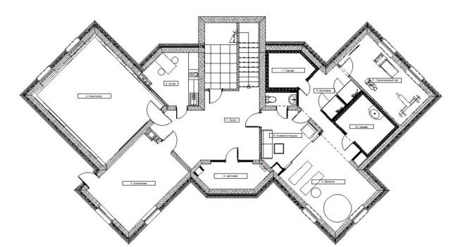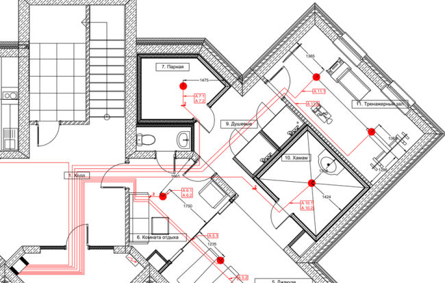 Вот дизайн-проект этажа, в котором надо реализовать аудиосистемы. Слева наверху на чертеже помещение для домашнего кинотеатра. В остальных помещениях нужен звук с потолка. Есть комната отдыха, тренажёрный зал, бассейн и хамам.