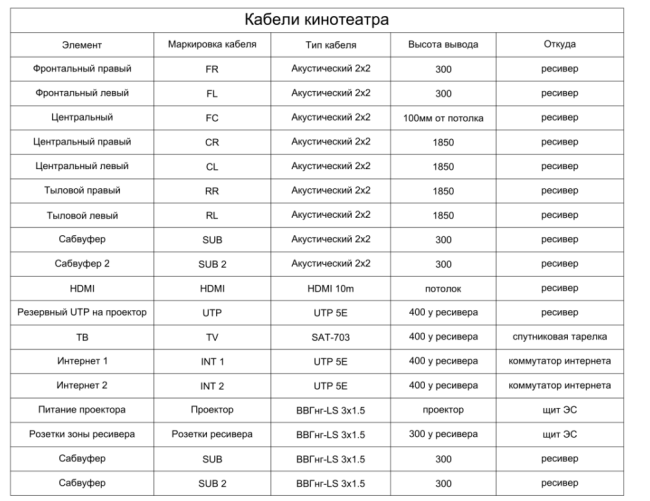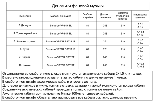 В парной и хамаме ставим динамики VP65R SST XT серии Extreme — для высоких температур и влажности. Это стерео динамики, к каждому из них нужно два акустических кабеля. Для комнаты отдыха стерео динамик обычной серии. Можно поставить два динамика и немного их разнести, но помещение небольшое, можно сэкономить на работах по встраиванию динамиков. Все динамики сводим в таблицу для удобства: