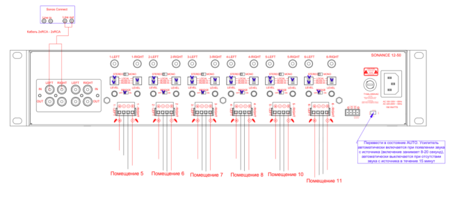 Далее у нас выбор: мы можем на каждую комнату поставить отдельный усилитель Sonos AMP, это позволит в каждой комнате слушать свою музыку и регулировать громкость независимо. Второй вариант: ставим один источник звука Sonos Port и многоканальный усилитель, который будет усиливать звук на каждую зону. Ставим многоканальный усилитель Sonance 12-50, это не самое недорогое решение, зато очень качественное и удобное. Усилитель ставится в 19-дюймовый шкаф, 6 выходов стерео по 50 ватт, регулировка громкости по каждому выходу. Схема подключения усилителя: