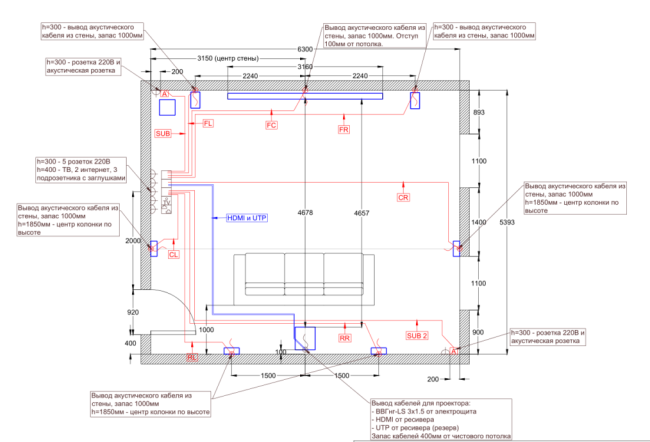 Это система 7.2: 7 динамиков и 2 сабвуфера. 2 колонки на полу справа и слева от экрана, центральный динамик под экраном, две тыловые колонки подвешены сзади, подвешены колонки справа и слева от дивана. Выводы для двух пассивных сабвуферов. Тумба с техникой у левой стены.