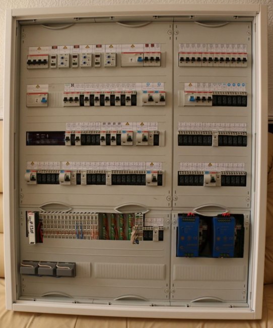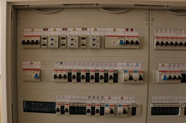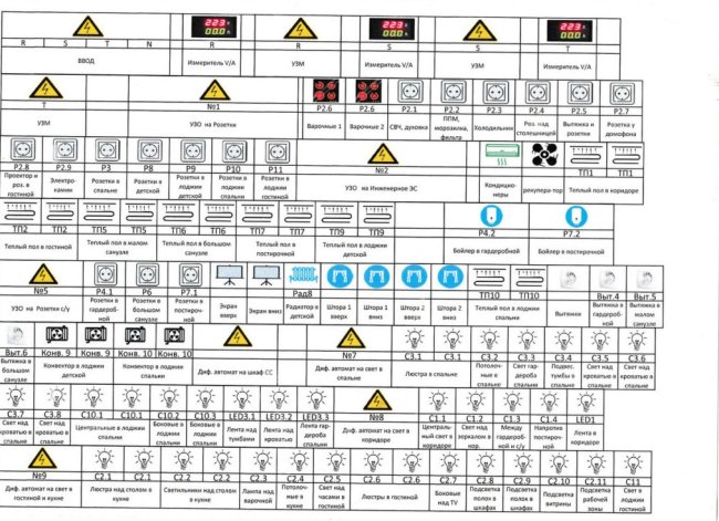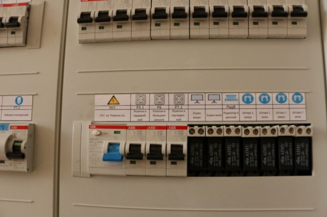 А вот готовый щит с закрытыми пластронами. На пластронах наклейки с описанием групп. Не «С 2.4» как на реле, а полностью, для пользователя.