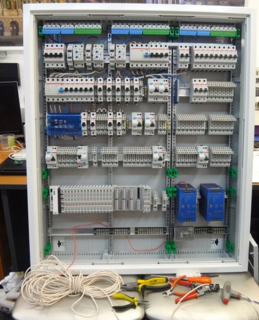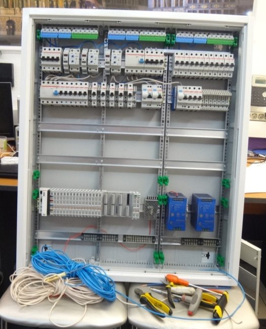 Следующее фото — собранный щит. Нет, это не четвёртый день, на сборку ушло больше времени. Нижние пластроны пришлось вырезать, чтобы разместить Beckhoff и блоки питания.
