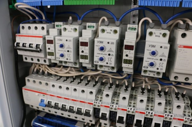 После вводного автомата стоят реле напряжения отдельные на каждую фазу и индикаторы напряжения и тока, для визуального контроля. Кабель проходит через индикаторы горизонтально насквозь, поэтому модули раздвинуты.