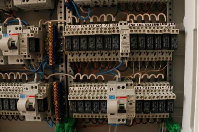 Здесь видно кросс-модуль розеточных групп и реле управления вытяжками и светом.