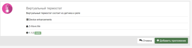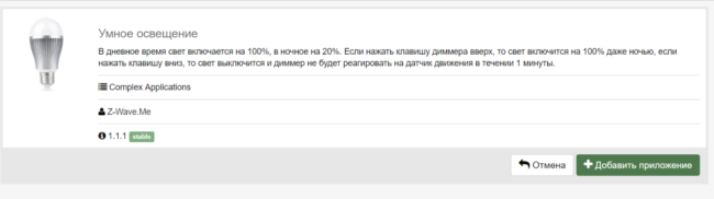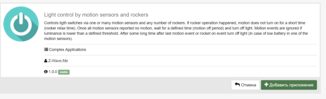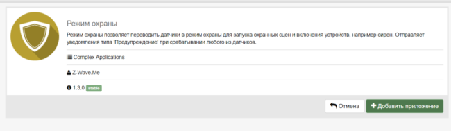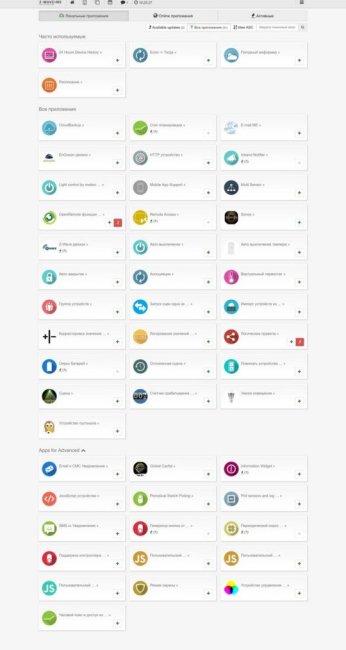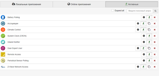 Интересно то, что приложениями тут является вообще всё, включая «Сеть Z-Wave», «логические правила ЕСЛИ — ТО», «Удаленный доступ», «Опрос устройств», «Опрос батарей устройств». Мне нравится такой подход, он означает, что, во-первых, эти приложения периодически обновляются по отдельности, во-вторых, если одно не нравится, можно использовать другое аналогичное. В общем, это подход Linux, а не Windows.
