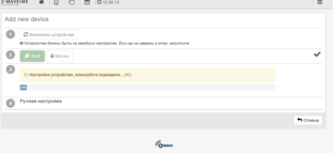 Выбираю метод подключения Unsecure. В процессе добавления шкала зависает на 99 процентах. Закрываю это окно — устройство, всё-таки, добавилось. Вот его настройки:
