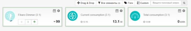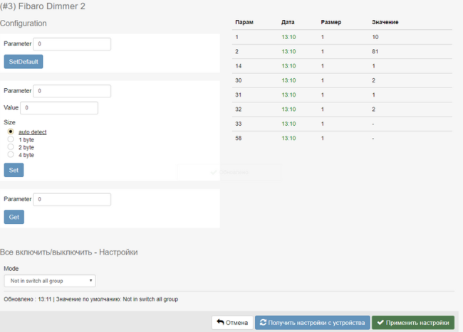 Удобно, что я вижу сразу значение всех параметров диммера. В контроллерах Philio и Netic надо считывать вручную каждый параметр. В списке устройств появились сам диммер и индикаторы его потребления.