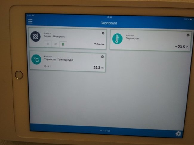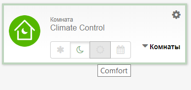 Никаких встроенных в контроллер средств настроек климата нет, всё делается только приложениями. Я поставил приложение Климат Контроль, оно позволяет заранее задать температуру Комфорт и температуру Эко. В списке устройств видим виджет, в котором можем выбрать комнаты и режим. Очень удобно.