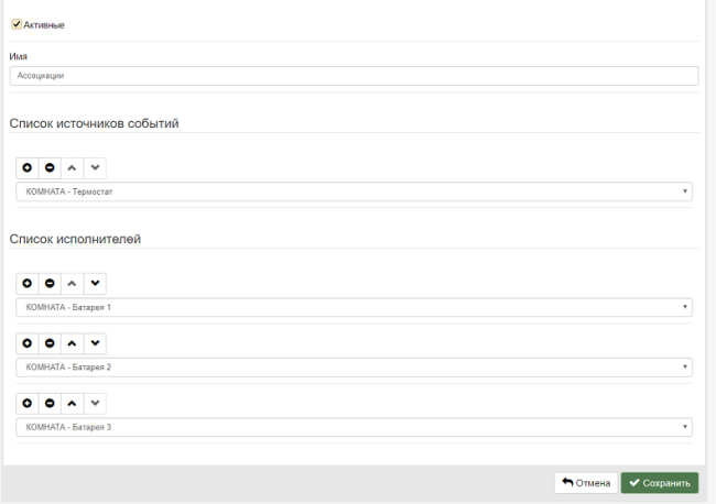 Но мне нужна ещё возможность задавать температуру с термостата. Это делается через приложение Ассоциации. Задаю в нем источник и исполнители.