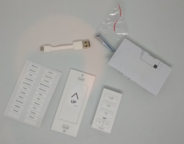 Сам пульт, настенный пластиковый держатель (просто плашка с магнитом), инструкция, пакет с саморезами, кабель зарядки USB-microUSB, забавная бумажка с наклейками с названиями комнат на английском, чтобы наклеивать на пульты. Пульт достаточно симпатичный, из белого матового пластика. Внизу разъём зарядки microUSB.