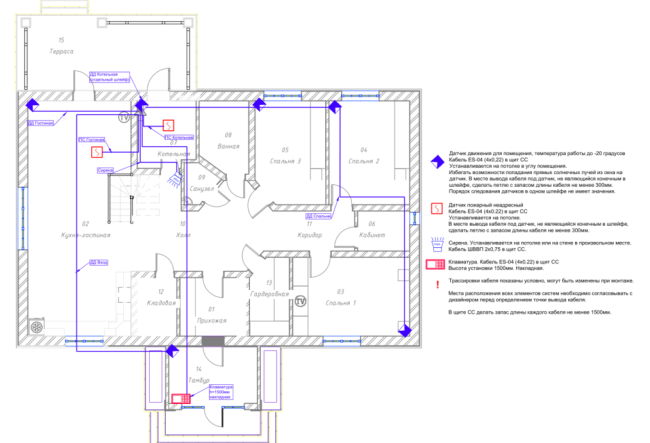 На плане нарисованы датчики движения, датчики дыма, сирена, клавиатура постановки-снятия. Линиями показаны кабели. Справа комментарии по монтажу кабеля и размещению элементов.