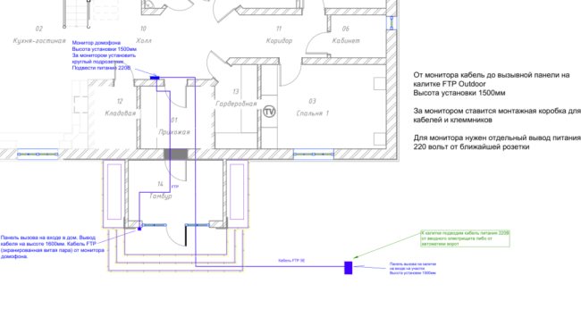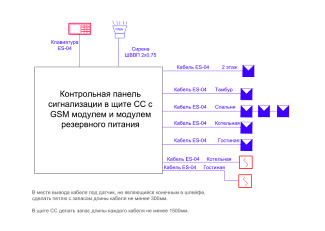 Кабели от контрольной панели до элементов нарисованы условно. В данном проекте я оговорил с рабочими, что они сами выбирают траекторию кабелей по месту, поэтому, например, кабель до датчика движения в тамбуре нарисован частично по улице, это просто условность.