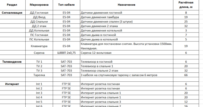 Вот кабельный журнал. Табличка, в которой перечислены кабели с указанием маркировки, типом и расчётной длиной.