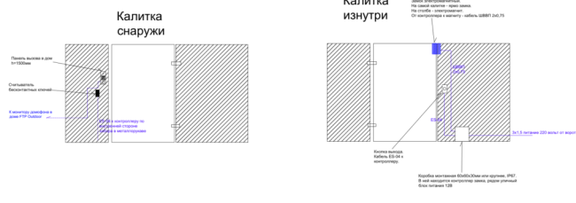 Схема расположения элементов и монтажа кабелей на калитке или двери крайне важна. В зависимости от выбранного оборудования (замка, считывателя, контроллера) эта схема меняется. Если вправа и слева от калитки столбы, что крайне важно заложить в них всё необходимое заранее.